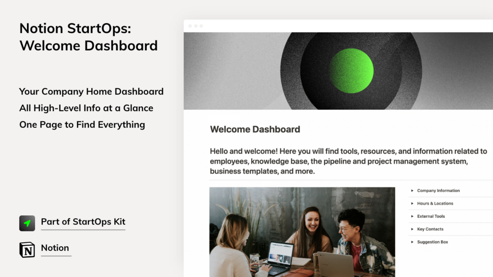 By setting this page as a Notion teamspace’s main page, it becomes your default intranet. Embed links and resources here to find everything easily.